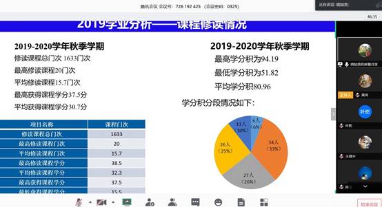 黄芮老师从年级层面分析了2019级学业预警与学业帮扶进展情况。各位班主任老师介绍了寒假以来,按照学院制定的班主任工作2月、3月的指导意见,通过和学业预警员工及其家长谈话、成立学业帮扶小组等举措,在班级层面开展的一系列卓有成效的工作。1901班班主任王靖宇老师表示,通过班级线上的集体答疑和集体讨论,形成了互帮互助的班级氛围,实现了共同提升的班级建设目标;1902班班主任叶昉老师谈到,通过和班委谈话,充分了解到学业预警员工日常在校表现,进而开展精准学业指导;1903班班主任符小卫老师帮助触发预警的员工分析学业存在的问题,并指导员工制定详实可行的本学期学习计划和目标;1904班官操老师提出,计划返校后引导员工进实验室开展科研活动。与会老师共同讨论了学业预警与学业帮扶中的重点难点工作。姚如贵副经理对2019级员工课程修读情况进行了学业分析,希望班主任老师对补考员工给予更多关注。