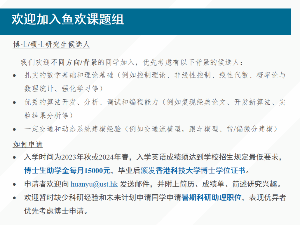 鱼欢院友课题组致力于研究与控制理论、机器学习、交通流建模,智能网联车相关的广泛课题。关注的核心问题是:如何将控制理论和深度学习结合起来,在保证稳定性、安全性、鲁棒性的前提下,推进智能网联交通系统控制和优化的边界。