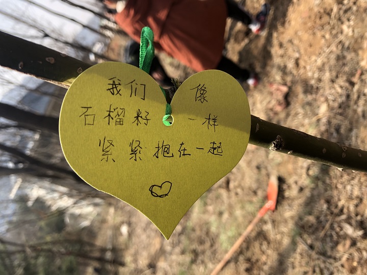 在活动的最后,同学们在卡片上写下了“我们像石榴籽一样紧紧抱在一起”。此次活动加深了本科生与少数民族预科生之间的友谊,而这份友谊将会像小树苗一样越来越坚固。学院也将继续把学雷锋活动推向新的阶段,传递正能量,也让更多的人真正地加入到环保活动中来,用行动保护祖国的绿水青山。